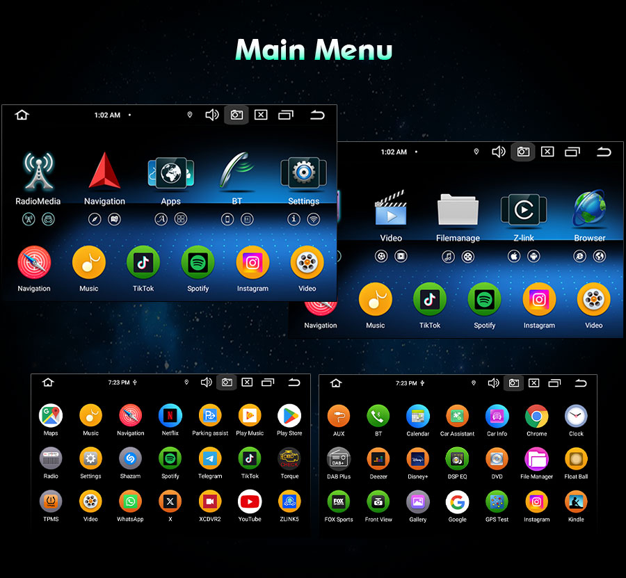 - Acceptă DAB+, DVB-T/T2, TPMS, OBD2, DVR, cameră AHD etc., funcții extinse.